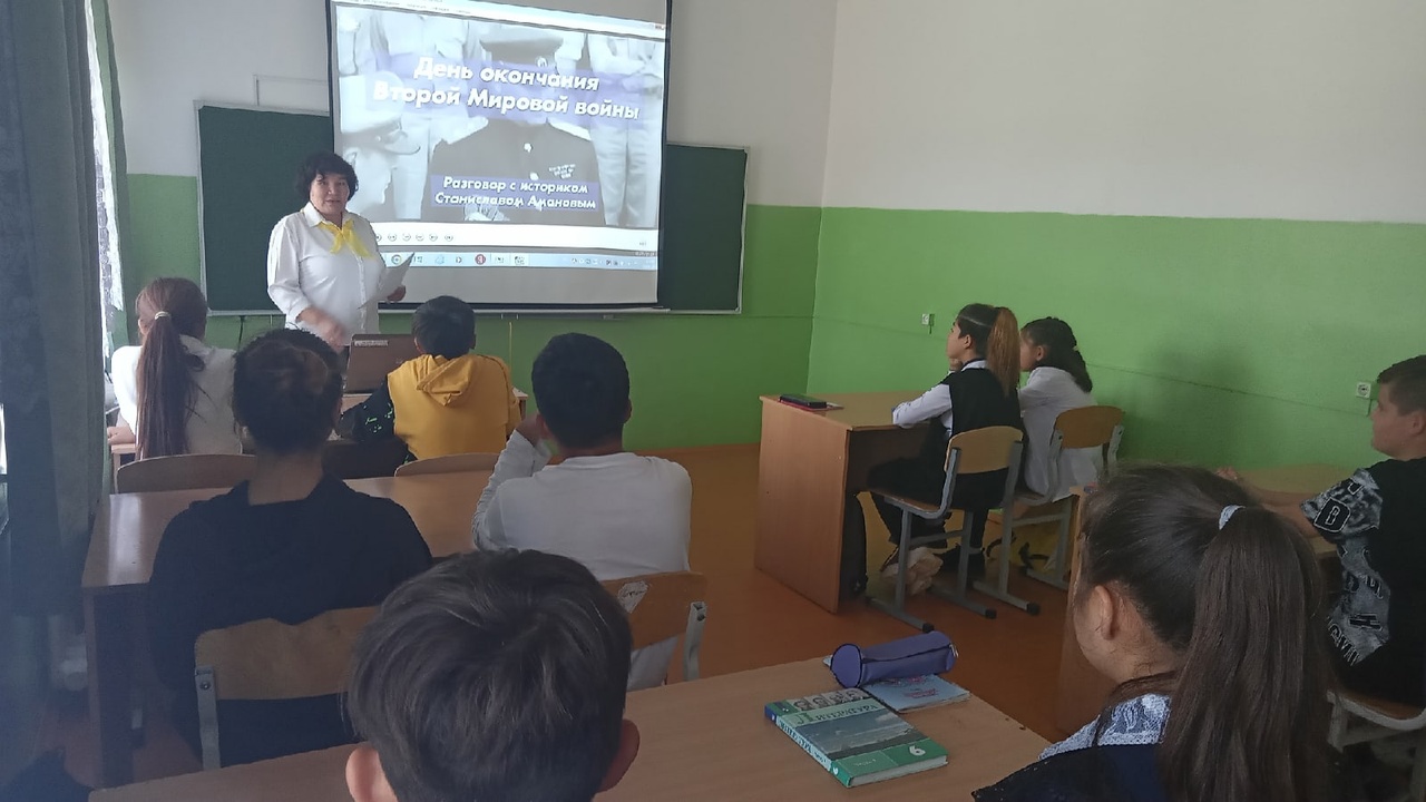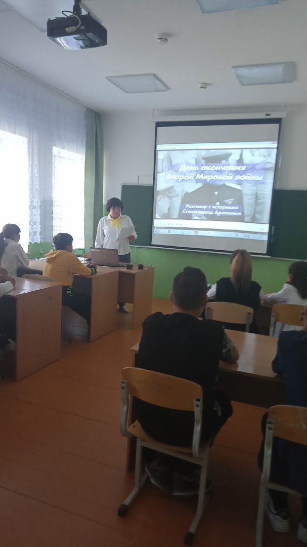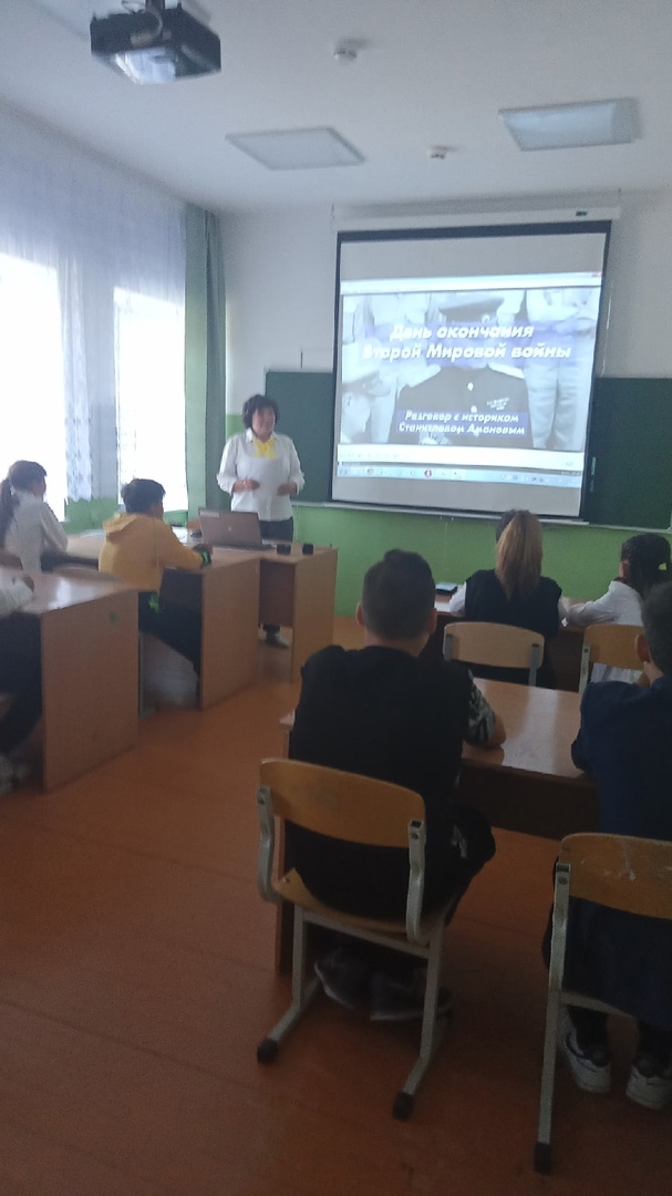 Окончание Второй мировой войны - это великое событие для всего мира. Именно в этот день был побеждён нацизм и фашизм, прекращено преступление против всего человечества. Мы должны помнить и чтить подвиг наших предков и их вклад в мирную жизнь современных государств. Сегодня в нашей школе советником по воспитанию и взаимодействию с детскими общественными объединениями Баязитовой Д.У. для обучающихся 9 класса был организован просмотр ролика "Разговор с историком Станиславом Амановым" об окончании Второй мировой войны совместно с Российским движением школьников.